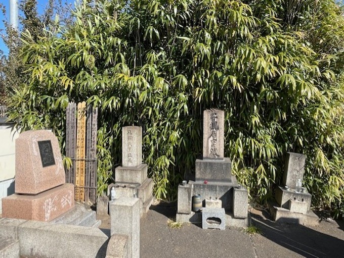 次に、子規の墓所のある田端の大龍寺を訪ねました。住宅地の中にあり、分かりづらかったのですが、道を歩いていた地元の中学生が場所を教えてくれました。大龍寺は改装中のため支柱に囲まれていました。子規の墓は本堂の左横に広がる墓地の奥まった所にありました。中央に「子規居士之墓」、その右側に母の「正岡八重墓」、左側に「正岡氏累世墓」と並んでいます。さらに左側に平成19年建立の新しい墓碑も立っていました。