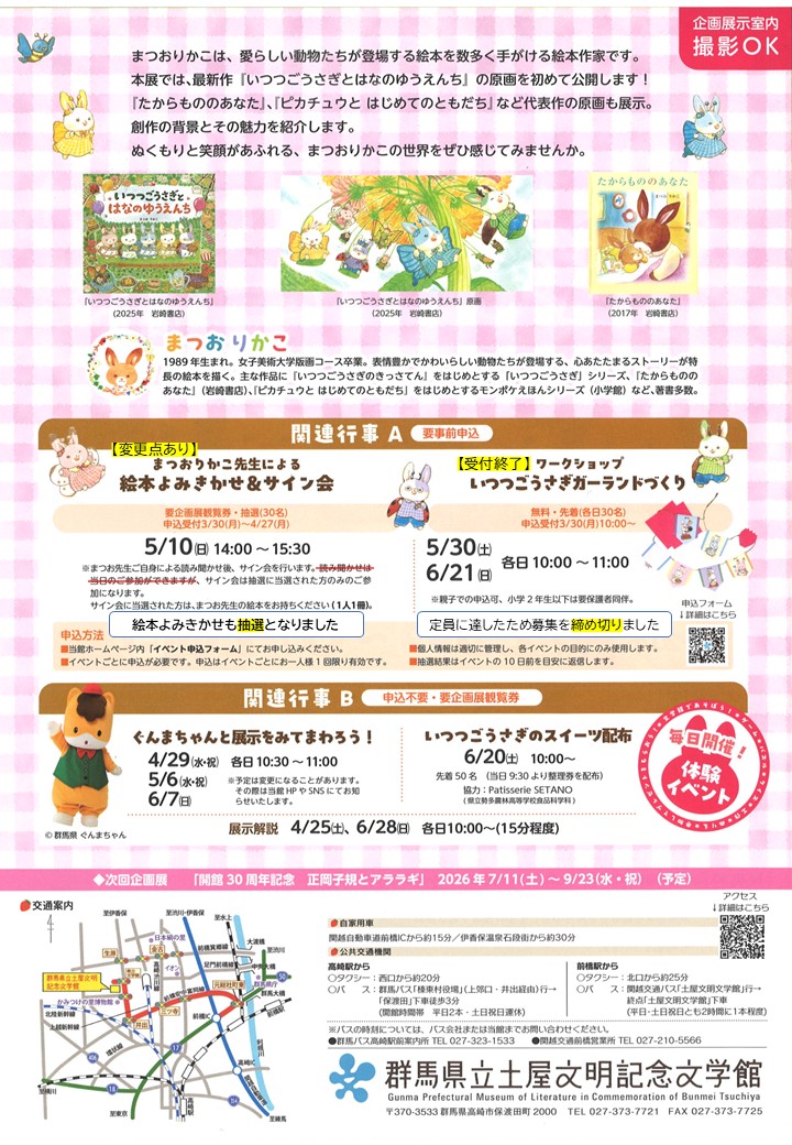 5/10(日)「まつおりかこ先生による絵本よみきかせ&サイン会」につきまして、皆様よりたくさんのご応募をいただきありがとうございます。現時点ですでに館の収容人数を超えるご応募がございますため、「よみきかせ」につきましても抽選とさせていただくことにいたしました。